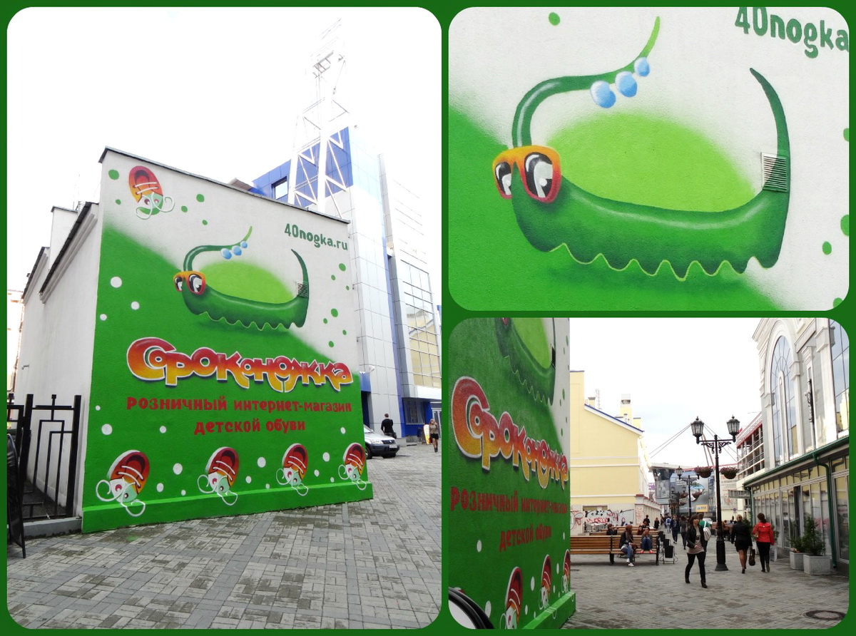 Наш виртуальный торговый центр говорит – нет! И дарит Екатеринбургу заряд энергии. Теперь в переулке между ТЦ «Гринвич» и Детской филармонией живёт весёлая Сороконожка! Зелёная, активная и позитивная – она танцует в ритме города! Ча-ча-ча! Ча-ча-ча! Невозможно устоять на месте! И вот уже пятёрка жучков-ботиночек начинает двигаться в такт, а вместе с ними – и всё окружающее пространство! Зелёный цвет пульсирует, растекается по свинцовым кирпичам тротуарной плитки, бежит по ледяному стеклу витрин, наполняя холодное бетонное пространство переулка жизнью!